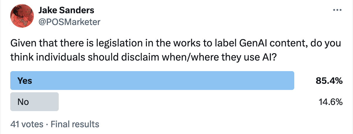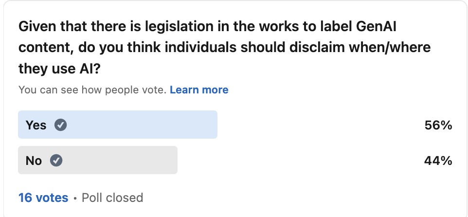 After reading an excellent post on labeling GenAI content, and researching a proposed AI-labeling bill in the US Senate, I took to social media (Twitter & LinkedIn) to conduct a rough poll, asking people if they thought labeling GenAI content was something they agreed with in a personal capacity. And the differences in responses were wild…