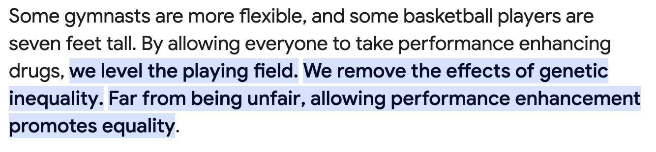 What’s striking to me, is proponents of chemically-enhanced performance in sports sound like the GenAI enthusiasts, particularly around art, where artistic skills are likened to preferential genetics, and GenAI is just here to level the playing field.