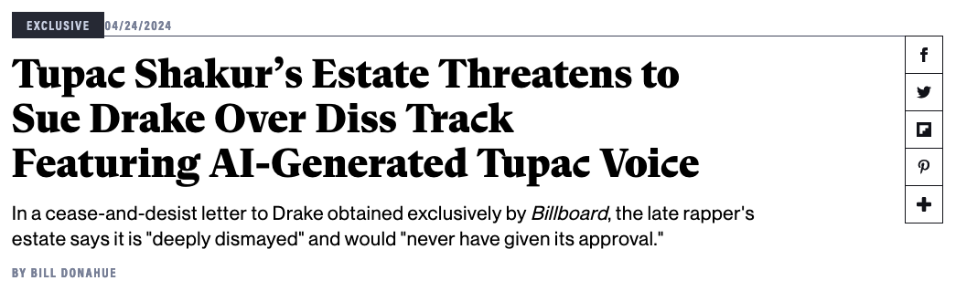 Last week, Drake released a diss-track response to Kendrick Lamar, wherein which he used voice clones of Snoop and Tupac to deliver a rap he wrote. My initial response was less than enthusiastic, and just today we find out the estate of Tupac sent Drake a cease-and-desist order.