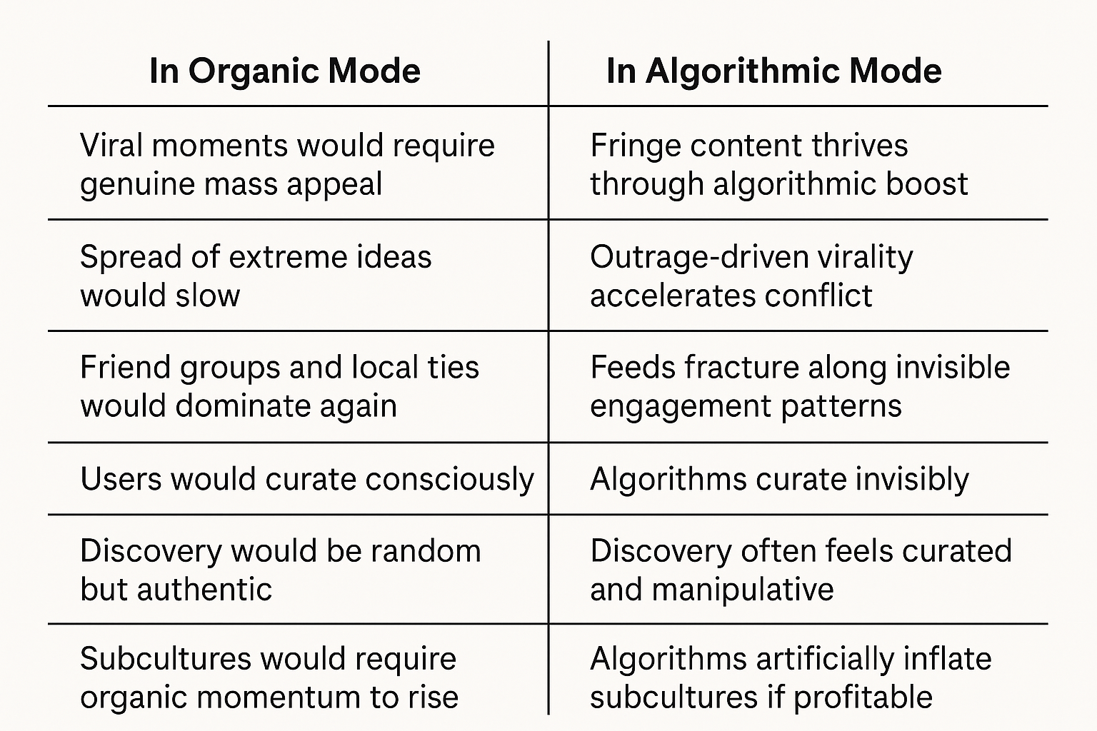 In the short term, social feeds would appear slower, flatter, even mundane. Polarization would ease. Virality would cool. The engineered emotional high would dissipate.