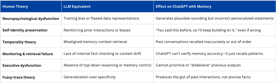 I don’t think I was being misled; I was being confabulated to, and I in turn was confabulated. Without a curiosity to scrutinize outputs, confabulation is the resting state of both LLMs and the casual AI researcher. And with persistent memory in AI, there are some striking comparisons to briefly note about the theories on what causes confabulation in human brains and how they might correlate to effects on outputs.