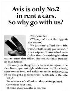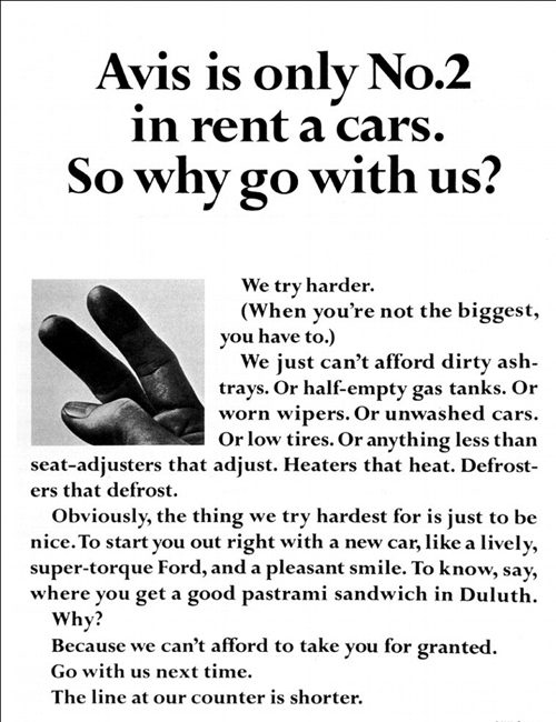 Avoid these things – Puffery, Vanity, Authority, Insincerity, Gimmickry – to create an ad that has rapport. Maybe find a weakness, admit it, share it – this can lend believability to things you say afterward. “Hertz is 2nd best” “It’s ugly, but it’ll get you there” “Tastes horrible; works”