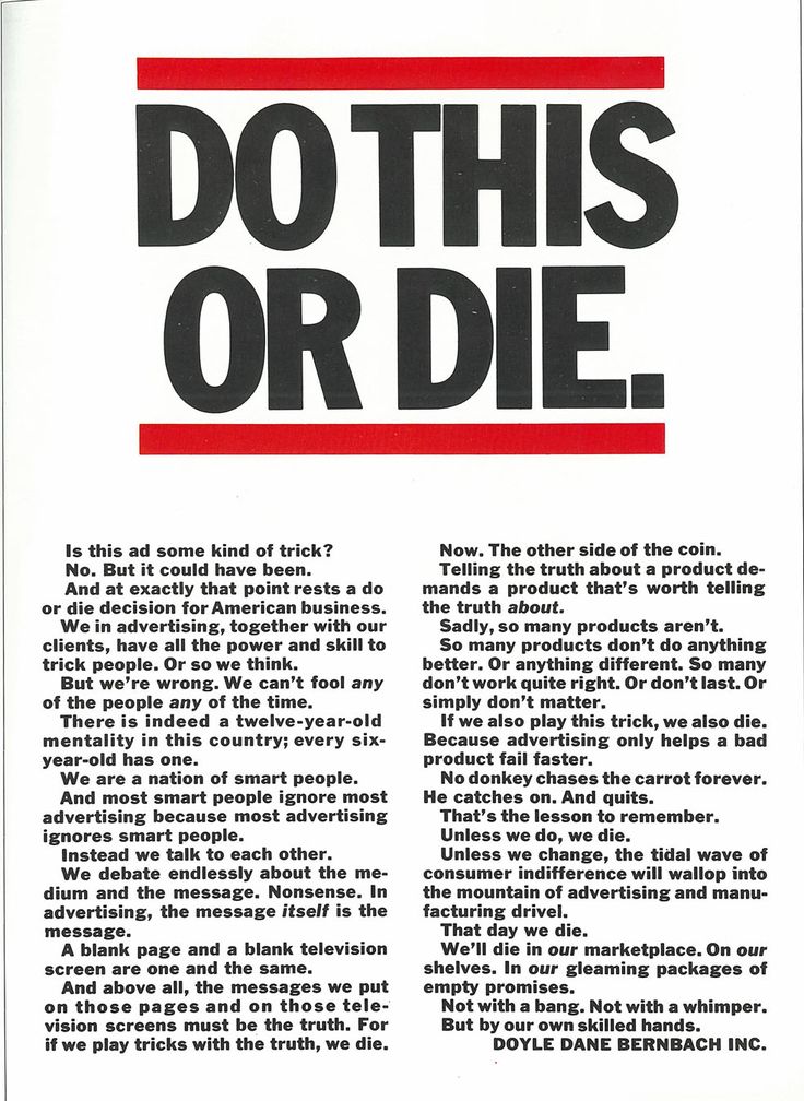 The balance between what a client wants for an advertisement, and what an advertiser thinks will work, is always shifting. The brand wants safety, security, and sales – the ad agency wants attention, awareness, and acquisition. Bernbach again, says it best; “Dullness won’t sell your product, but neither will irrelevant brilliance.” This balance is the life and death of ads. Mostly the death.